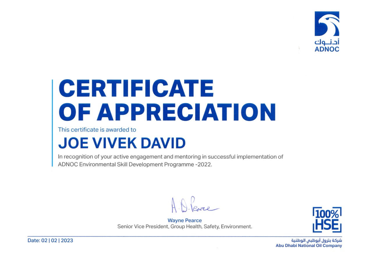Certificate of Appreciation - ADNOC for mentoring in environmental skill development